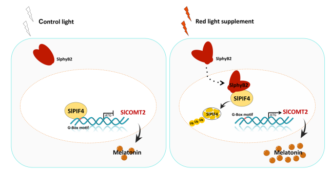 图1. 红光诱导番茄果实褪黑素合成的分子机制示意图