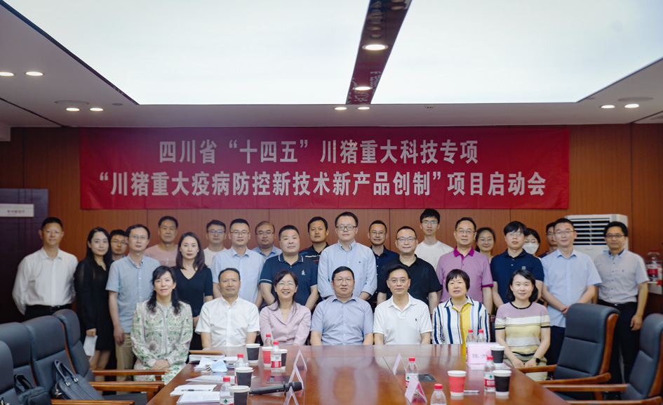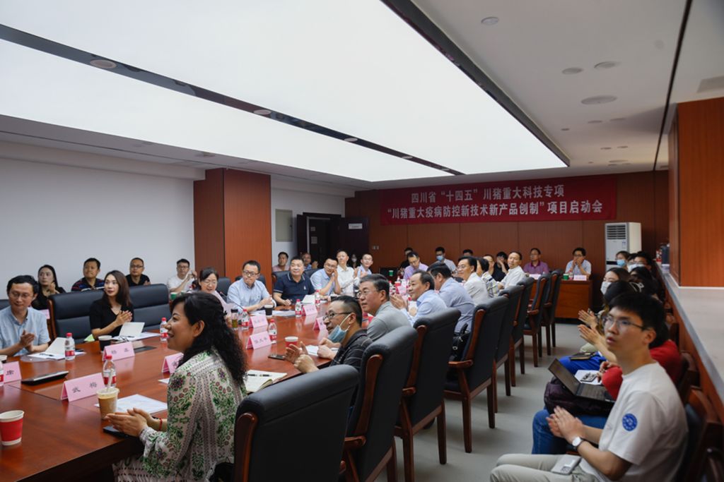 四川省科技厅、农业农村厅、bat365在线中国官网登录入口科研院相关领导、项目牵头单位bat365在线中国官网登录入口及项目参加单位四川农业大学、四川省畜牧科学研究院、四川省动物疫病预防控制中心、天津瑞普生物技术股份有限公司、四川畜科生物工程有限公司、四川铁骑力士食品有限责任公司、四川德康农牧食品集团股份有限公司有关专家和课题组成员参加会议。