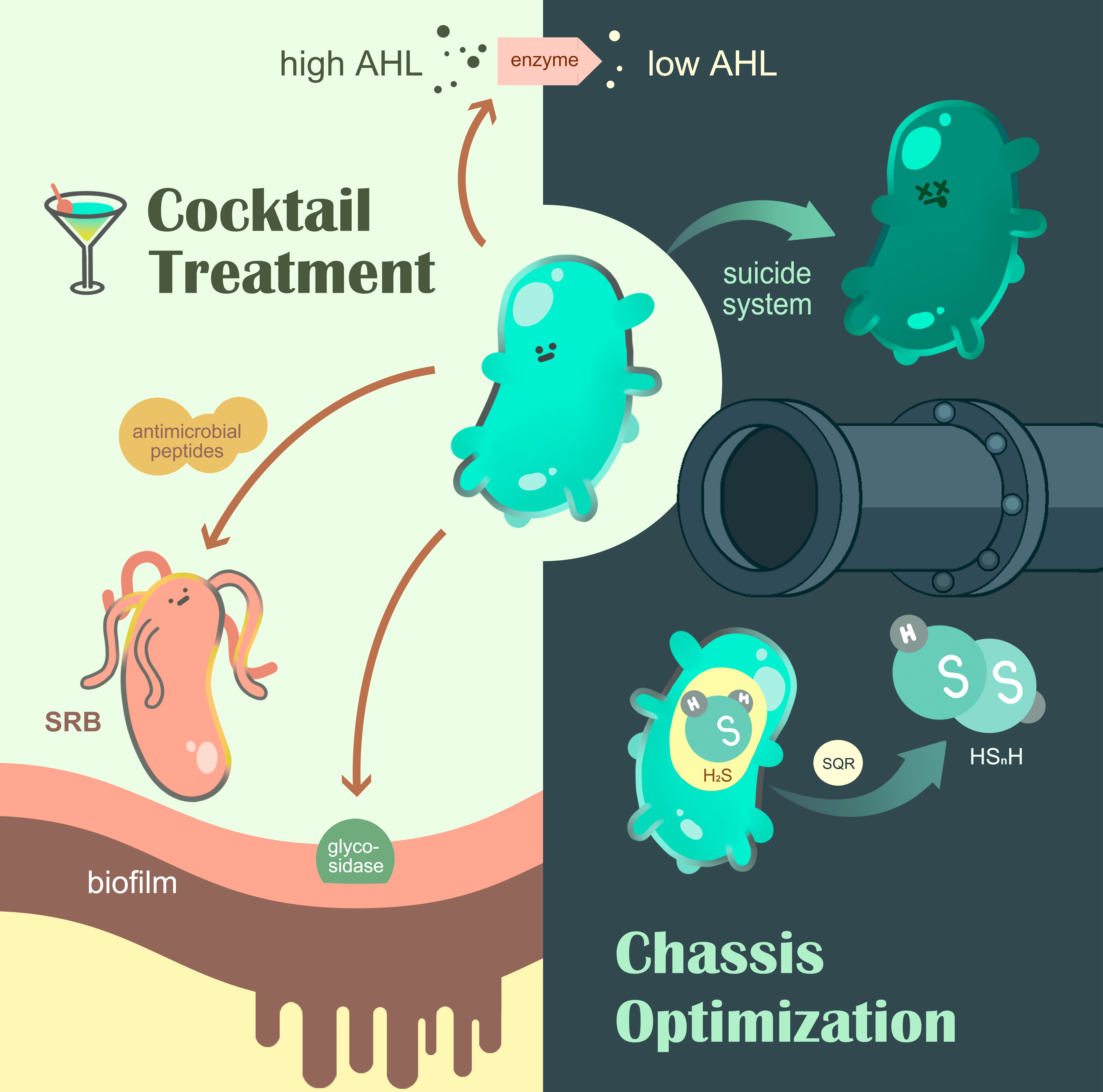 2023年iGEM课题聚焦于城市下水道中的有害气体硫化氢的治理,团队瞄准消除下水道中产生硫化氢气体的主要微生物—硫酸盐还原菌(sulfate-reducing bacteria, SRB)的目标,利用合成生物学方法设计了一个针对于下水道中硫酸盐还原菌的“捕食者”—SRBQuencher,该系统能够高效的消除硫酸盐还原菌从而降低下水道硫化氢气体浓度。该设计针对SRB生物膜导致SRB难以被灭杀的特点引入针对其生物膜主骨架的糖苷酶,使SRBioQuencher具备消除SRB生物膜的能力;又通过降解群体感应信号分子高丝氨酸内酯抑制SRB重新聚集和形成新生物膜;再通过表达抗菌肽杀死SRB,这种鸡尾酒方案实现了膜降解、细菌消灭、聚集抑制等多种功能。此外,SRBQuencher还通过表达硫醌氧化酶以转化底盘生物自身生产和下水道中现存的硫化氢气体,提高了下水道硫化氢清除效率。项目还利用SRB群体感应分子为诱导分子设计SRBQuencher的自杀调控系统,实现SRBQuencher数量随SRB表达的群体信号分子浓度变化的自调控,鸡尾酒疗法方案和自杀调控系统联用使SRB和SRBQuencher在下水道中的浓度能够依据环境需求震荡变化,提高了SRBQuencher的安全性。该项目的表征和应用,有望显著减少下水道硫化氢气体的产生以降低其危害,还为预防和控制易形成生物被膜的有害细菌提供了一种全面、安全的生物控制策略和工具。